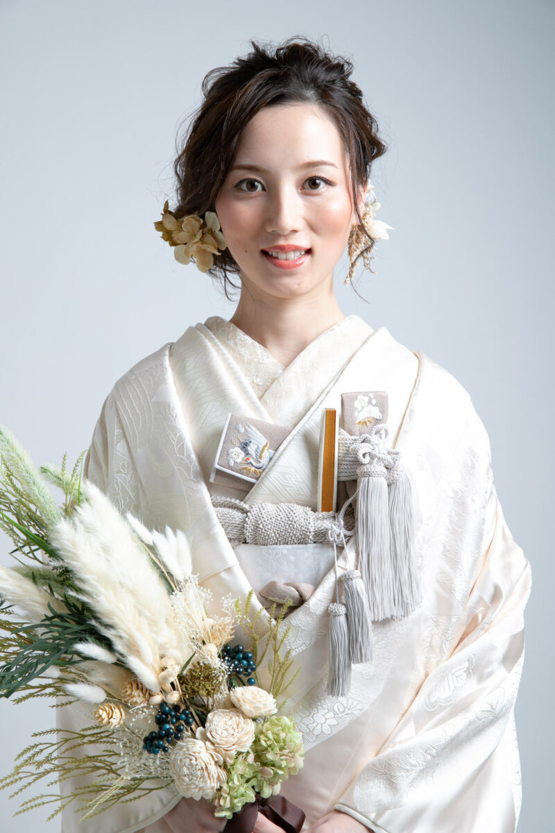 - 白無垢・小物: 純白よりも、少し柔らかい印象の生成りやオフホワイトの白無垢をセレクト。掛下や小物もグリーンやベージュ系でまとめると、統一感が生まれます。