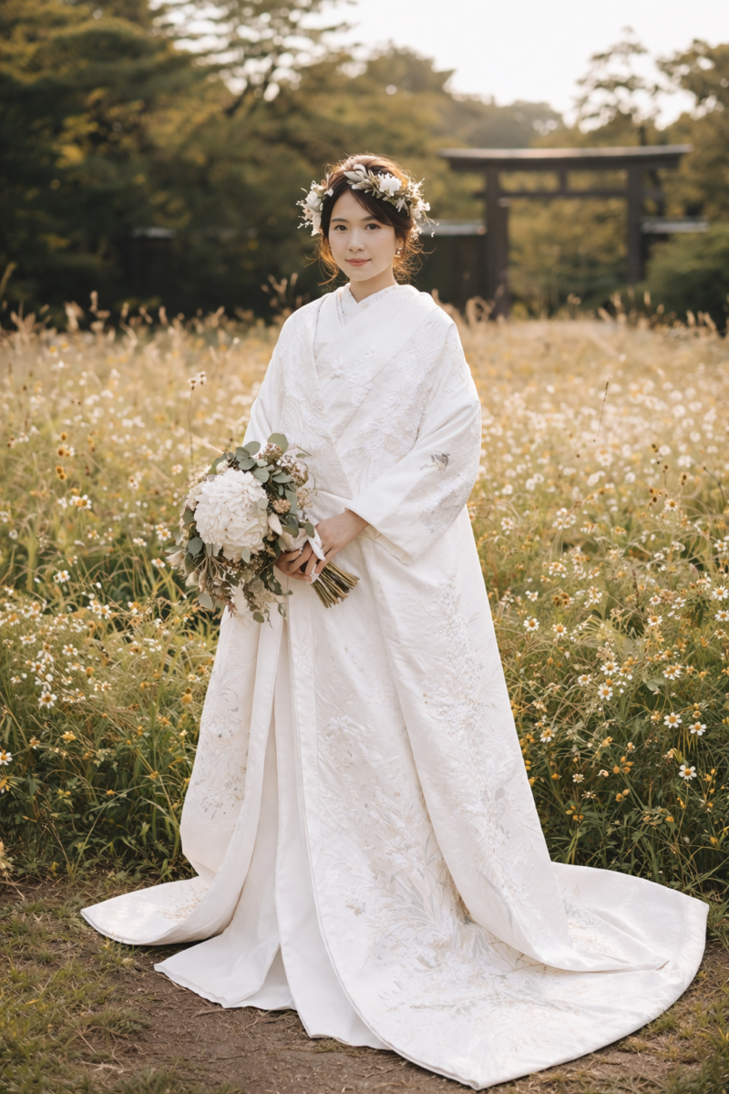 - インナー・小物: 白無垢の中にハイネックのレースインナーを合わせるのがトレンド。足元をブーツにしたり、チュール素材のヘッドドレスやトーク帽を合わせたりと、自由な発想で楽しめます。